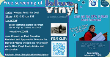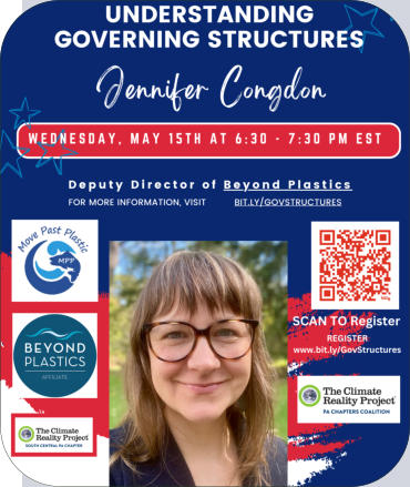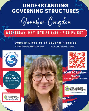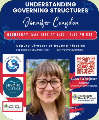 Wednesday, May 15th at 6:30 - 7:30 pm ESTSouth Central PA Climate Reality co-hosts the conversation and bring your questions on, zoning, ordinances, public works, land development, who to contact for contamination, what is the county commision and when do I reach out to them verses my municipality, how to meet with your local and state government leaders and more. How to Taking Legislative actions while engaging in cross-collaborative work among various organizations. Learn who to talk to, and how to address issues of concern at the different government levels. Beyond Plastics will provide this information.Guest Presenter - Jennifer Congdon is the Deputy Director of Beyond Plastics and one of its founding staff members. She is a thoughtful and pragmatic nonprofit management and environmental policy expert with 20 years of experience. She served three New York Governors in appointed leadership positions and has led numerous organizations to reach fundraising and organizational growth goals. She has been passionate about the environment and activism since the age of eight, when she convinced her parents to participate in the boycott of McDonald's to end their use of polystyrene. It worked! They phased out the practice in 1990. She still believes that one person can make a difference and is in awe of the power of collective action.Blue Vinyl Watch Party DiscussionThis is a watch party and discussion of the harms of polyvinyl chloride. We watch an excerpt of Blue Vinyl and Jess Conard, an East Palestine Resident and Appalachia Director for Beyond Plastic, video about video about Ohio's Toxic Derailment and Polyvinyl ChlorideJess Conard joined the discussion, and we explored solutions.Blue Vinyl is a combination detective story, eco-activism documentary, and rollicking comedy that puts a human face on the dangers posed by polyvinyl chloride (PVC) at every stage of its life cycle.As environmental movie distributor Bullfrog Films puts it, “Consumer consciousness and the precautionary principle have never been so much fun!” Recognition: Winner of a Sundance Film Festival Award, nominated for two Emmy Awards.Synopsis: Turned off by her parents’ decision to put vinyl siding on their small Long Island house, director Judith Helfand takes viewers on her 5-year adventure across the United States and to Europe to get the back story on vinyl. Along the way, she meets area residents who suffer from cancer and respiratory ailments–shining a spotlight on environmental justice years before the term became popular. She shows how they became empowered to test local air quality using simple buckets–soon discovering how vinyl chloride in the air often exceeded limits, arbitrary limits, because there is no safe level of exposure to vinyl chloride.