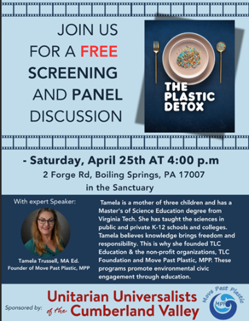 Saturday, April 25, from 4:00-6:00 pm2 Forge Rd., Boiling Springs, PA 17007In the SanctuaryLEARN ABOUT THE DANGERS OF THE CHEMICALS IN PLASTICS THAT IMPACT OUR HEALTHPlastic isn't just a problem with unsightly litter and trash; plastic changes our body chemistry. The dangers of using plastics have an unprecedented health toll on fertility, puberty, obesity, and many bodily systems and organs. The engaging documentary, "The Plastic Detox," follows the research of scientist and reproductive epidemiologist Dr. Shanna Swan and other experts, demonstrating the impact of plastics on human development and showing how we can take action. Follow the stories of several couples struggling with infertility as they make changes to eliminate plastic in hopes of conceiving.The Unitarian Universalists of the Cumberland Valley's Social Justice Committee has arranged for local expert Tamela Trussell to provide additional information and answer our questions following the film screening. Please join us on Saturday, April 25, from 4:00-6:00 pm